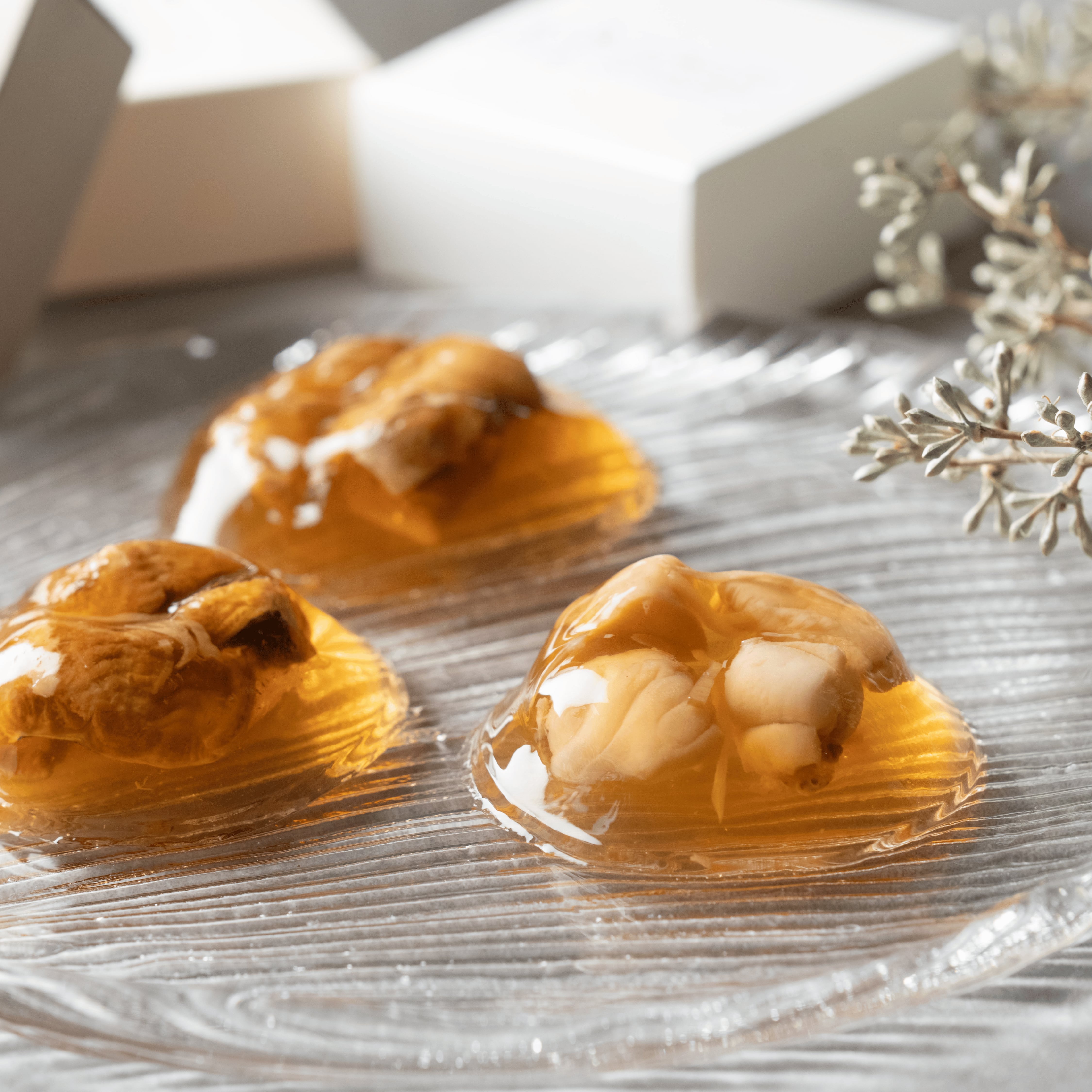 新鮮な魚介類を使用した贅沢な煮凝りの3個セットです。どの味わいも一口で楽しめる、さまざまな海の恵みが詰まった特別な一品です。